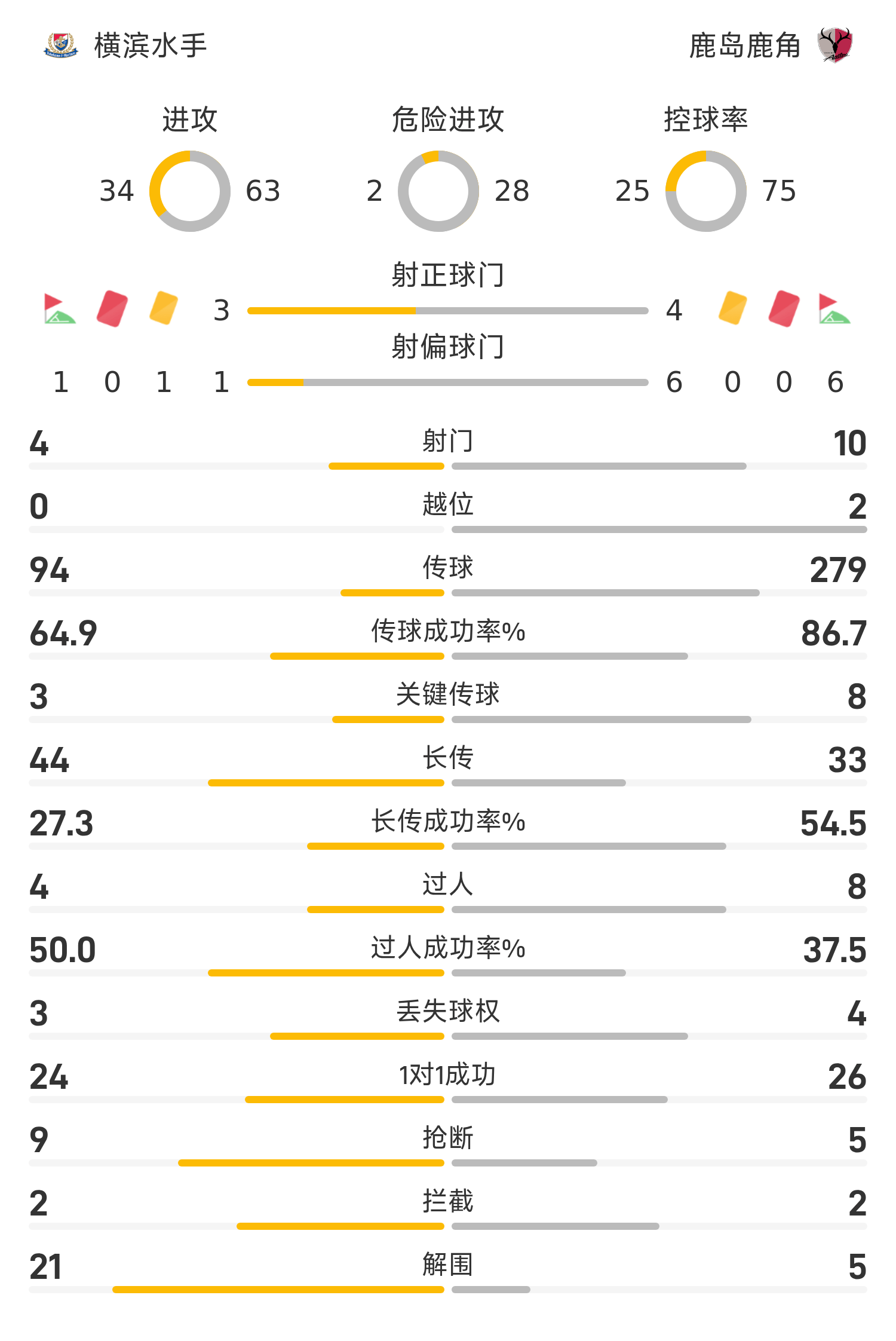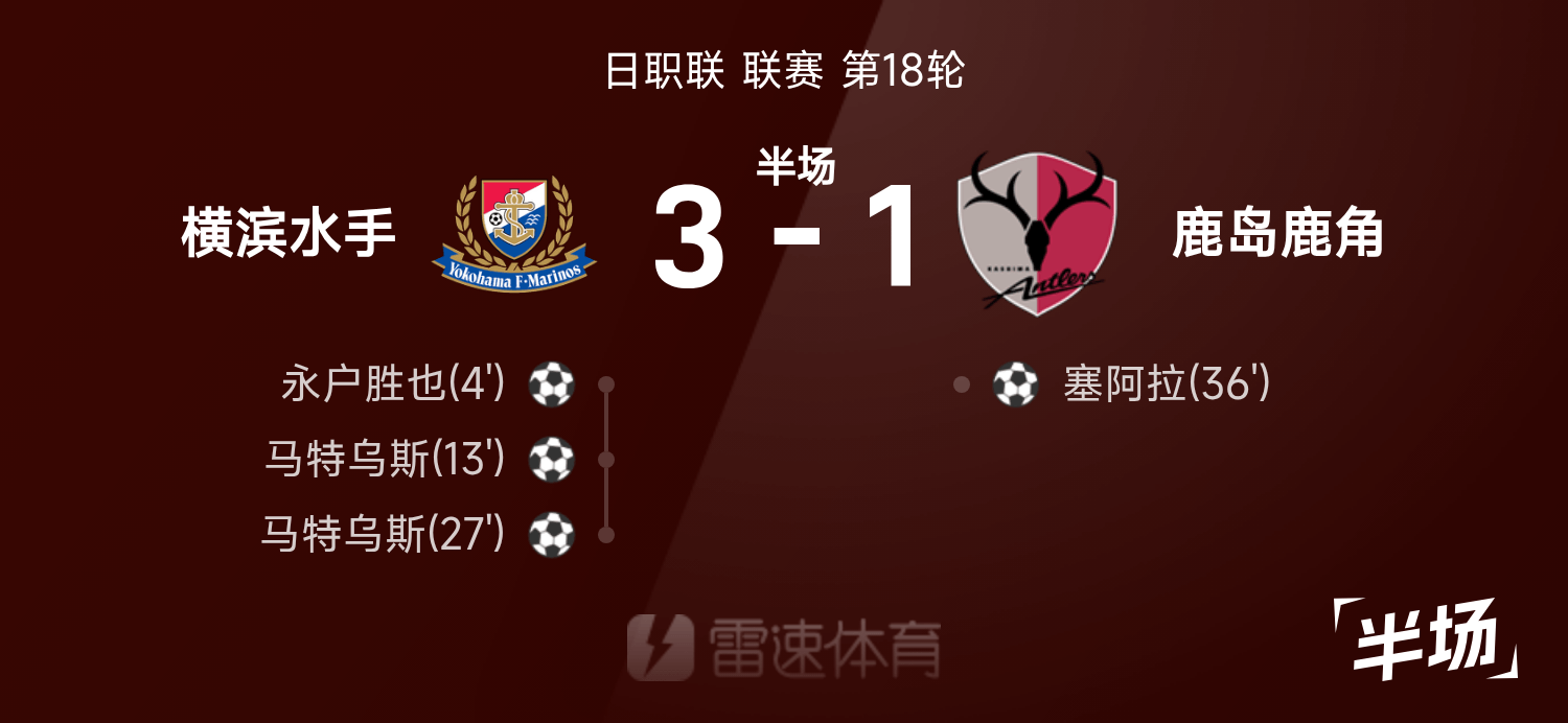 05月25日讯 25赛季日职联联赛第18轮,横滨水手迎战鹿岛鹿角。半场战罢,双方比分暂为横滨水手3-1鹿岛鹿角,马特乌斯上演梅开二度。